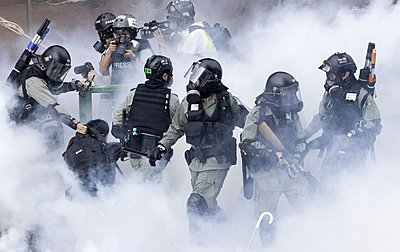 The photographer has a gas mask on, so should be OK regarding the tear gas, it's the protagonists that can cause the problems in these circumstances.
