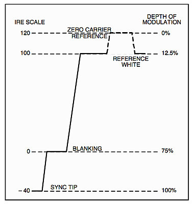 2- The maximum composite allowed signal depends from broadcaster to broadcaster... NTSC spec allows for up to 120 IRE, although you may want to clip at 115 IRE. This is because old sets aren't good at discriminating between video and audio at that high a level. (This is the gist of Charles Poynton's book.) ~120 IRE is where video bleeds into audio. 3- In a composite signal, the sync signals are at -40 IRE. If your picture has composite IRE values that are too low (i.e. <20 IRE), then receivers will confuse picture with sync signals and the picture won't be stable. 4- That's what I can figure out anyways. There can be lots of conflicting and bad information on the internet. Sometimes it is best to get the broadcasters' specs, since these vary from broadcaster to broadcaster! |