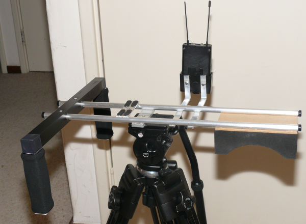 My first rig is sorta complete for the first camera and works very well indeed and on it's own is very lightweight. Essentially it's 2 x 1/2" parallel aluminium tubes around 24" long with a neoprene shoulder pad on the back end. On the top faces of the tubes I have a piece of flat bar to mount the camera,. Underside in the front is a similar bar that takes my ENG spring rod and waist belt to take the load off the front end. I then have a piece of 1" square tube with handles go you have an alternative grip ..the tubes actually go thru the square tube...offset and under the camera mount is a 1/4" aluminium plate with a 1/4" tapped hole and that takes the tripods quick mount plate so I can slip the entire rig onto a tripod too!! Instead of mounting my radio mics on the camera I made a quick mount with two bars that hold the receiver .... the nice thing is that you can split the camera from the rig but also use the whole lot on a tripod ....shoulder mounted I use the LCD for framing and focus. Thought I would share with the AC130/160 owners but it would also work nicely with an HMC150!! Chris |