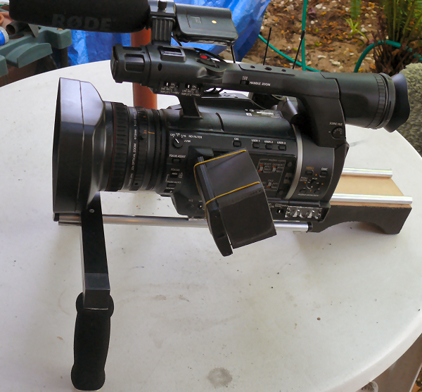 You are a man close to my bank balance too???? I asked the guy at the foam shop to cut me two blocks of high density closed cell foam about 6" x 3" x 3" I then with utmost precision cut a piece of card 6" x 3" and using my CD tube drew an arc on the card and the foam shop cut the curve for me with his fancy rotating knife (sorta like a band saw with no teeth) ..nope it wasn't a high tech design but it worked out fine. The closed cell foam is more durable and more "rubbery" and using a box cutter just hacks it to pieces. CineCity in India wanted $270 for a rig plus $55 for shipping so it was getting pricey for two...I think I spent about $70.00 total for all the material ..it's all aluminium tube and flat bar and everything is pop rivetted together. The rig could be a LOT simpler of course..just two rails with a pad on the end would also work but I wanted to mount my receivers on the rig too rather than try to mount them on the cam handle!! It's not as pretty but it certainly work well!! My only issue is being old and decrepid my vision isn't as good as it used to be and I hate working with glasses as my long vision is perfect!! I am thinking of using a creditcard sized fresnel lens on top of the LCD hood to magnify the image a bit much the same method as the HMC80 uses...with the EVF at the back end of the camera, using that means your front camera weight gets really heavy so I'm not even using the EVF at this stage!! Chris |