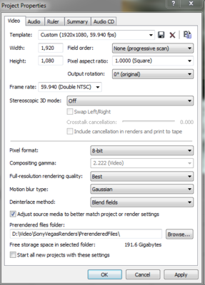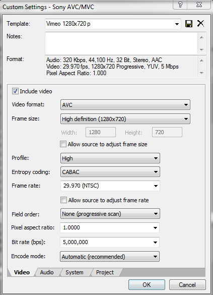 1) Transcode the MTS files to AVI using Cineform. You can get a free copy of the software at GoPro.com 2) Open Vegas project with settings in attached image 3) Add AVI files to Vegas project. (AVI files will allow for smooth playback during editing) 4) Edit (disable smart re-sample on all clips) 5) Render with settings in attached image. 6) When you are finished with project editing, you can delete AVI files to save space. DO NOT delete the MTS files. Quote: