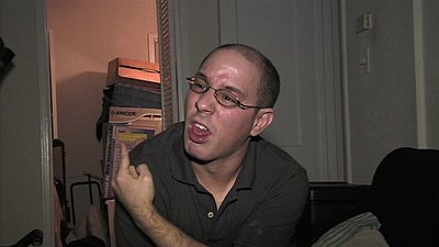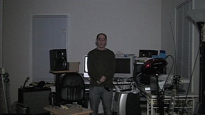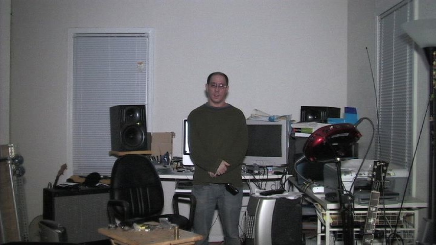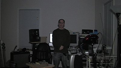 I thought it might be nice to have a tungsten-ish source for reference in the background, so I left the lights on in the storage room/sleep quarters of Bass studios behind me. It's one of those lights that's attached to your ceiling fan, so whatever kinda bulbs those are. . .well, that's what you're seeing the light from. So you can see how other 3200K sources might change with the different white balances I used in these last tests. You can also see what the microbeam does on a pure white surface (those walls in the room with me are basically white). By the way, those walls (the white ones, not the ones in the other room) are about 18-20 feet from the light if you want an idea of how the exposure falls off over distance. First off, that quarter minus green plus half CTO, with the indoor wB preset I mentioned before? Looks terrible, didn't bother to post a pic of it. Ok so, left pic is half CTO on the light, manual white balance AFTER the cto was put on. Right pic is a half CTO AND a quarter minus green, manual white balance AFTER the CTO was put on, but BEFORE the minus green. I know that one's pretty complicated. So, you can see that on the right, my face is a purplish color like I've been choking, but my arm looks okay. What's up with that? the white walls also have slightly purplish tinge. In the left pic, my face looks more natural but my arm's a little green, and the walls have a slightly green tinge. Now, I am a pasty fella always told he needs tan. Well you know what? I don't tan, I burn! The room behind me looks orange on this here computer montor, but on my NTSC monitor it looked like it looked to my eye. So, I say with this light either of these two options is your best bet to match an indoor environment's lights (more than likely-if they don't have weird mercury lights or something). If you don't mind the slightly purple cast, go with the quarter minus green (or hey, you know what? See if you can dig up some 1/8. . .I think it exists.) If not, go with the no minus green. The half CTO appears to not cut out too much light, but makes a pretty big difference. I just want to note, if you use half CTO, you'll have to buy it. . .this isn't one of the filters that comes with the light. Also, regarding sensitivity, the XL2 is rated at 320 ASA from what I've read. |