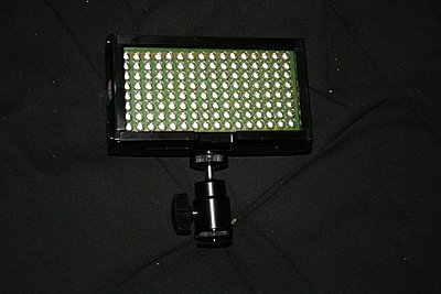 It measures about 5"x3, most of that (except a 1/4" on each side) is LED surface. It feels fairly solidly put together, comes with a swivelly gimbally thingy for your hot shoe mount (and also a screw if that mount is screw-in instead of slide-in) Also comes with a selection of color correction gels and a little plastic folder to hold them. There's a "warming" gel (looks like it's equivalent to a 1/2 or 1/4 CTO, a "tungsten" (quotes indicate what they wrote on the gel) that I'm guessing is a full CTO, a "diffusion" (seems like Lee 251 or Opal. . .one of those thin ones that you can kinda see through), and a minus green. There's a slot directly in front of the LEDs that holds the gels. You just slip it in. There's no way to secure it on top, meaning if you turn the light upside down it'd just fall out, but I guess you could tape it in or something. I don't know how much it weighs, but you definitely feel it with a battery on there (I'm using the big cannon battery right now, for an XL2). That's what I got so far. |