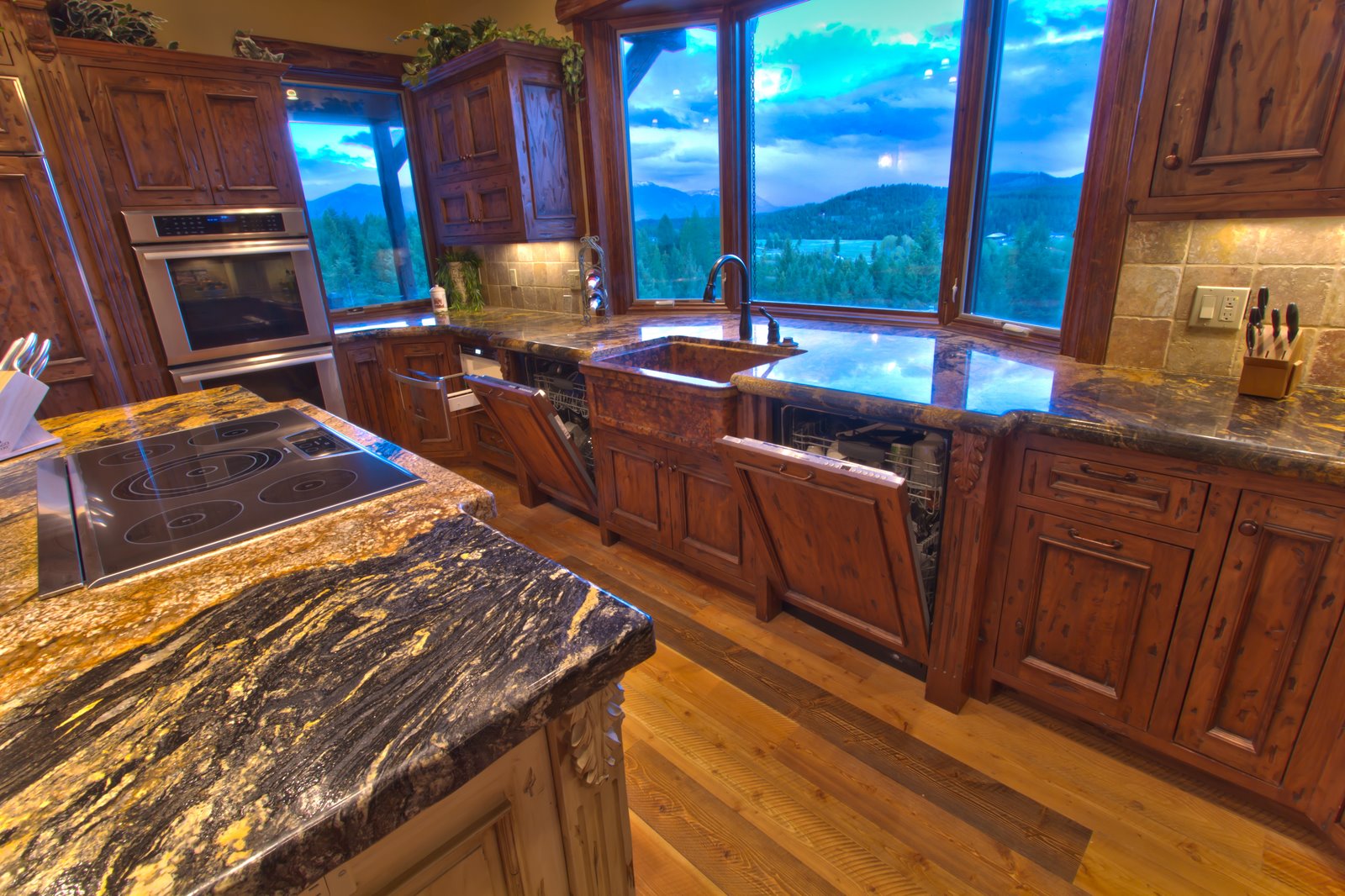 I'm going to be filming a series for a cooking school in a cool lodge style house with an incredible kitchen. That's the good part. The bad part is there are three big windows (bay window) directly behind the main cooktop area where most of the action would be happening. There's also a window off to one side. The producers want to keep the awesome mountain views in the shot as my HDR pics I took below show. HDR in Photoshop is one thing (taking multiple exposures and piecing the right parts together so everything is exposed well), but in video I'm having a bit more of a challenge. What would be the best and most cost effective way of handling this? Is there some sort of ND plastic that can be applied to the windows so everything's not blown out? Although this is an ongoing program, it is still a house that is in use most of the time so it either needs to be removable or nonobtrusive. I see windows all the time on news programs, but I've never had to do a setup like this before that is going to be an ongoing production. |