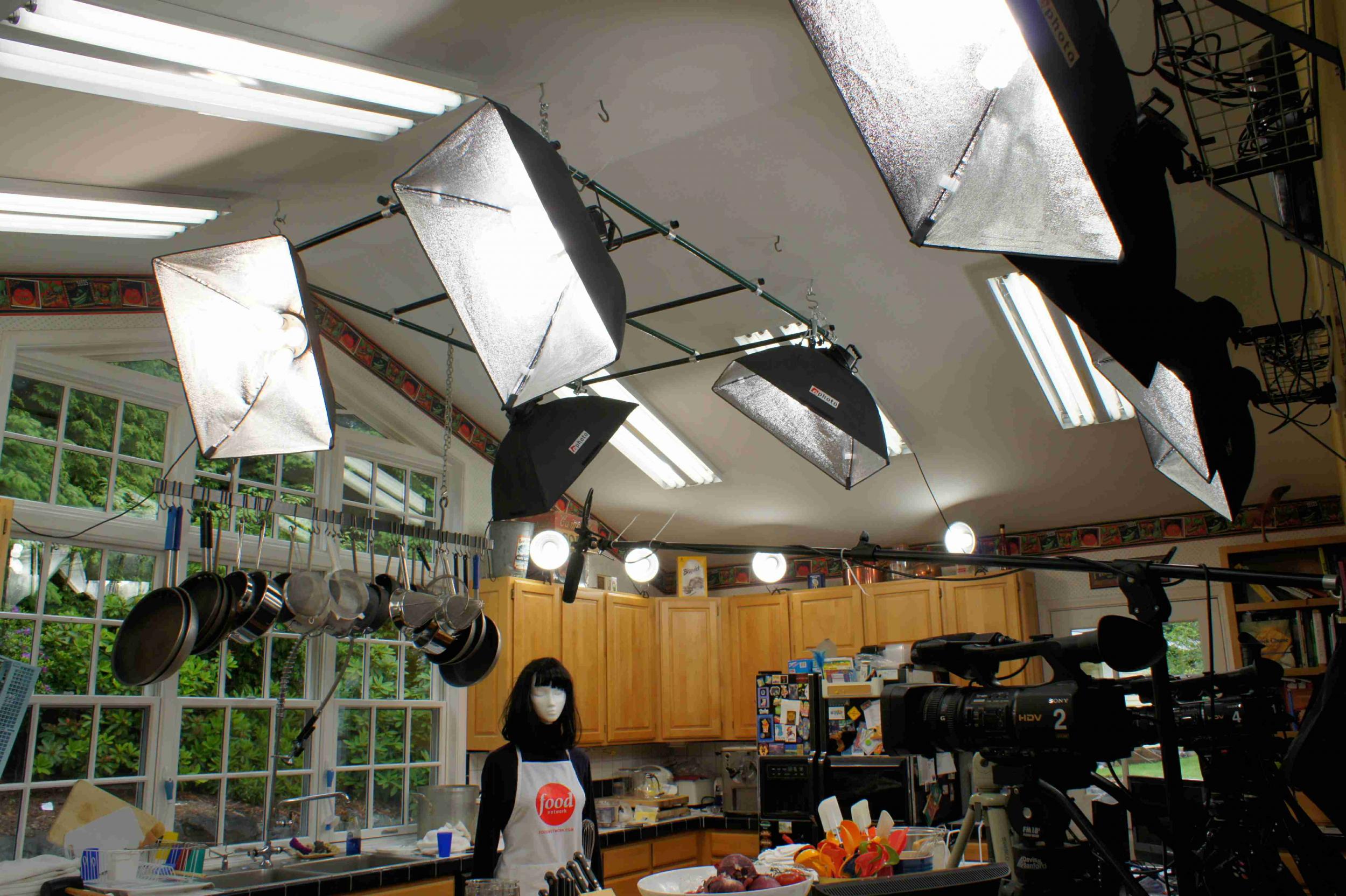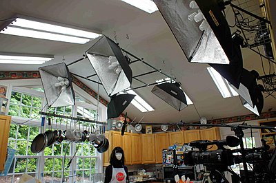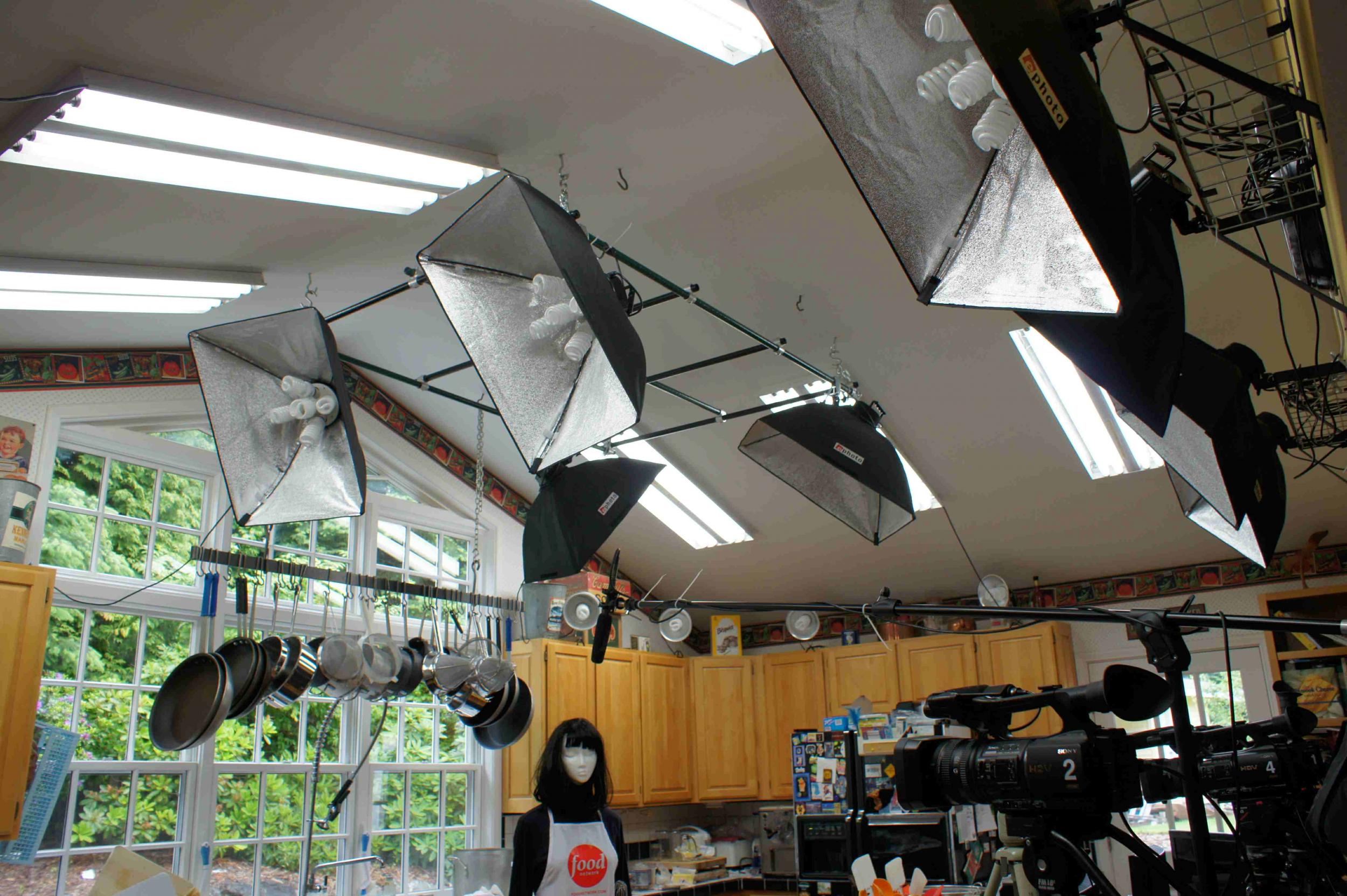 Our overall strategy was to make the inside light more like the outside, in both color and intensity. As the light changes so rapidly and frequently outside here in the Northwest -- both in intensity and in color -- we've laid in a supply of 1/4 orange (#3409), 1/4 plusgreen (#3316) and both 1-stop (#209) and 2-stop (#210) ND gel rolls, and are fabricating them in such a way as to get them up and down quickly as needed. We added four 30-amp circuits to the kitchen studio to accommodate the power requirements for lighting and to run the four cameras and monitors and other equipment. We've pumped the light levels inside the kitchen up so high that even with the windows ungelled, if it's a typical crappy Seattle day outside, it looks like night. We're using eight ceiling mounted CFL softboxes with the diffusers removed and a dozen CFL reflector floods at 5100K, total actual wattage about 3200W for an incandescent equivalent of about 12KW. The kitchen has a high vaulted ceiling so we built a lighting grid for much of the lighting as well as an overhead cam. We're doing test footage at the moment and we have the cams manually set to 5600K, a nice compromise between the 5100K lights inside and the very blue outside light, which can get as high as 6500K. This way the outside light still looks a little blue -- we have the gels to take care of that if it's too blue -- but inside the CFLs look warmer. The window faces east so we never really get any direct sunlight through that, as our talent is never awake before noon.