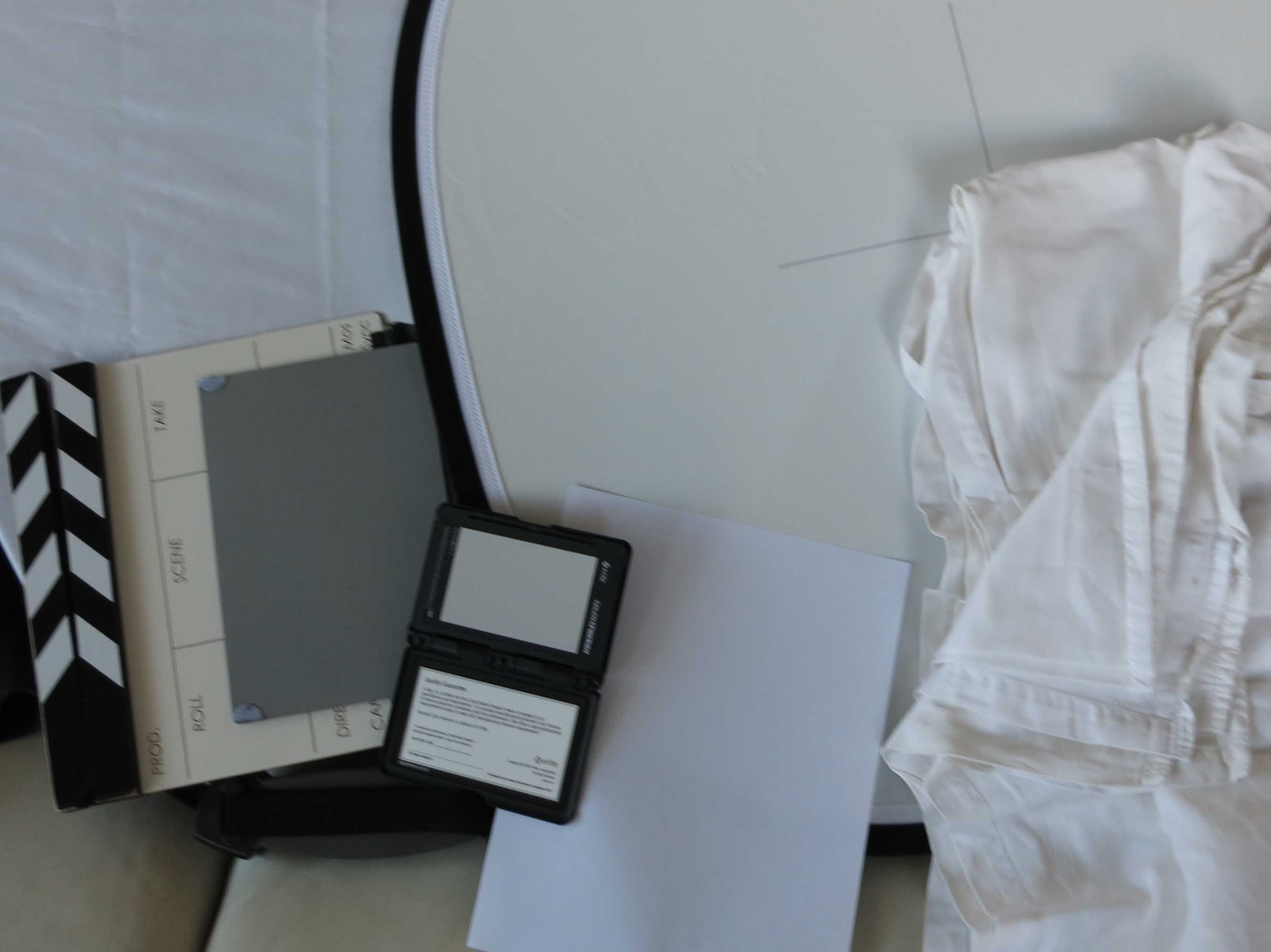 Going clockwise from upper left: Lastolite tri-flip white panel Lastolite Ezybalance An old "white" sheet A sheet of laser printer paper The Gretag MacBeth ColorChecker white panel (in top of black plastic frame) RMI digital grey card on top of a cheapo clapper. (on the bottom are the cushions of a white leather couch). This photo was taken at daylight color balance setting on a Canon s110 camera, and color not adjusted in post. I am glad that I got the Lastolite Ezybalance; it seems to be well calibrated to proper color balance and I am surprised how useful the cross target is for framing. However I'm not happy with the way that the Ezybalance doesn't tend to lay flat; it has a tendency to curve into a saddle configuration reflecting different colors from different directions on different corners. |