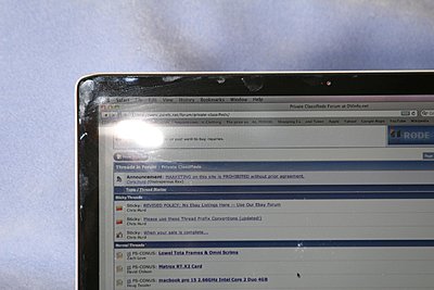 has slight cosmetic damage but works perfectly . This is the unibody version of course 2.66GHz Intel Core 2 Duo 4GB 1066MHz DDR3 SDRAM - 2x2GB 500GB Serial ATA Drive @ 5400 rpm SuperDrive 8x (DVD±R DL/DVD±RW/CD-RW) MacBook Pro 15-inch Glossy Widescreen Display Backlit Keyboard (English) / User's Guide Last edited by Doug Tessler; January 21st, 2010 at 08:47 AM. |