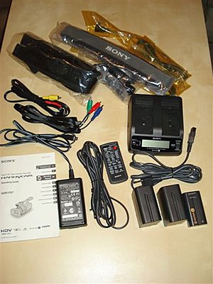 Includes all standard accessories: cables, remote, manual, Sony battery, UV filter (been on since the first minute). Also included are two extra capacity batteries (generic), dual battery charger (Sony), and Sony travel case. See attached pics.