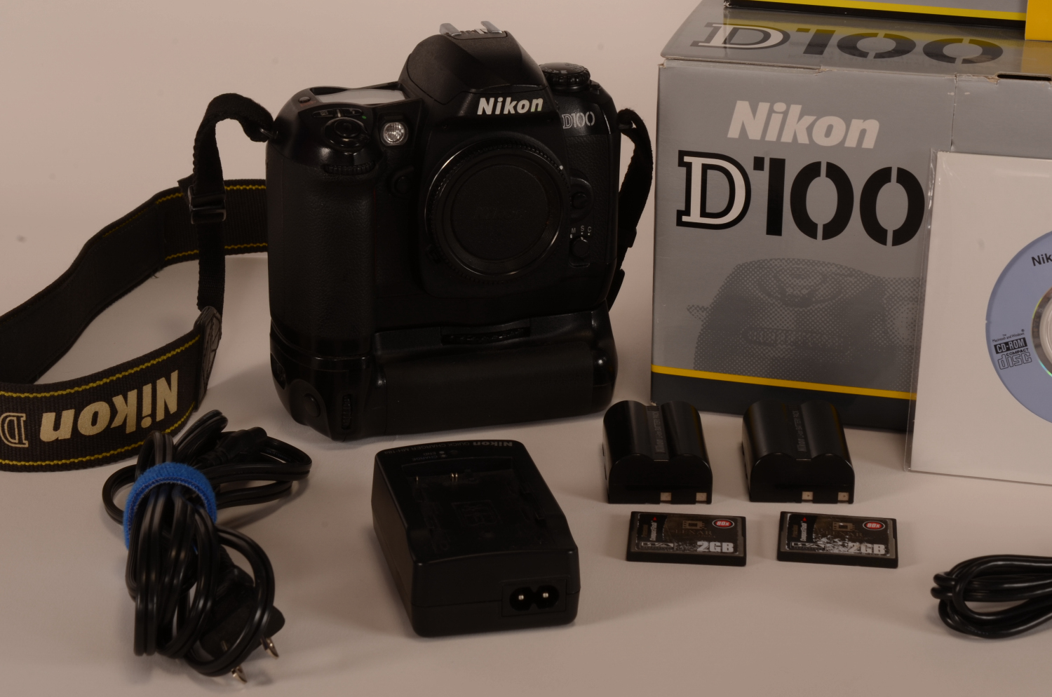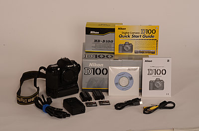 For sale is a Nikon D-100. It has the MB-D100 dual battery compartment. I purchased this camera new at Calumet Photo Chicago. It is not a grey market camera.