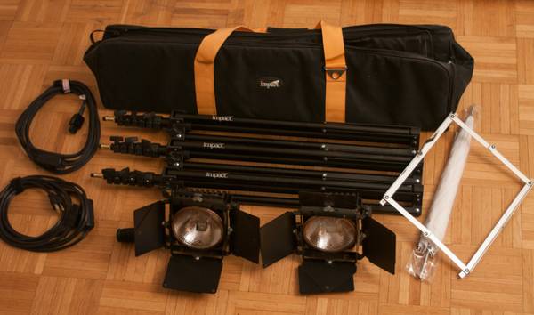 * LOWEL OMNI LIGHTS (x2) (includes power cords) [new costs $180 each] * FTK 500w BULBS (x6) [new costs $20 each] * LOWEL OMNI BARNDOORS (x2) [new costs $65 each] * LOWEL GEL HOLDER (x1) [new costs $35] * LOWEL WHITE REFLECTOR UMBRELLA (x1) [new costs $25] * IMPACT LIGHT STANDS (x3) [new costs $20 each] * IMPACT LIGHT BAG (x1) [new costs $50] new this kit would run you more than $800 + tax. i'm asking $450 (obo). shipping is extra.
