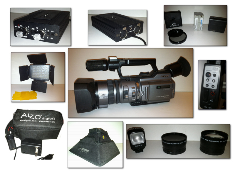 • Used but not abused, this camera has been used as a backup cam for weddings and for the last 3 years, our weekly sermon cam at my church. I have moved on to HD so everything I have below goes with it. I have no clue as to drum/head/fan hours, etc. because this camera does not track that information. The following items go with the camera: • Beachtek DXA-6 Dual XLR adapter w/48 volt phantom power (works fine except one channel needs volume control repair) • Wide angle macro adaptor lens • 2x zoom adaptor lens • “eBay” LANC controller • Cinetactics foldable matt box • ALZO 770L Led camera video light kit w/belt battery kit option & chargers • (2) 58mm Mercury Optics ND filters • (2) 7400mAh high capacity batteries w/charger • (3) Sony Premium DVC tapes • Original camera box I would like to sell this as a package. $795.00 for everything or make me a fair offer. Thanks, Last edited by Steve Loeffler; November 23rd, 2012 at 07:48 PM. Reason: picture |