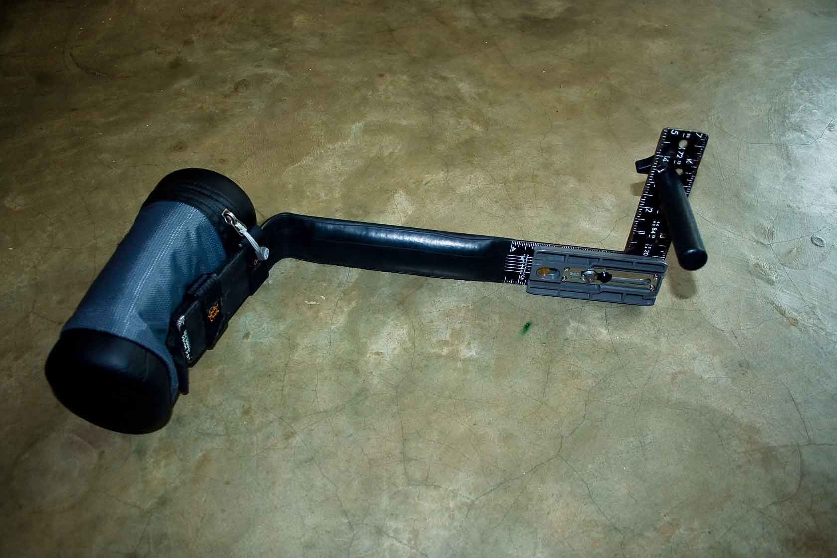 i had originally tried to find a T-square, so that i could have handles on both sides of the camera, but none i found were flat at the T crossing (screws or rivets). i think it would have been more stable, but this way i can keep my left hand on the camera to help stabilize and always be manning the focus/iris. PLUS, it actually fits in my tripod bag!!! |