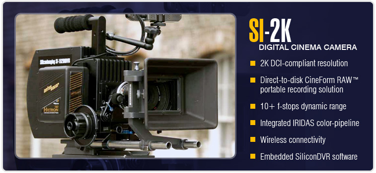 Hollywood, CA, November 1, 2006 –Silicon Imaging, with help from CineForm® and Intel Corporation, today unleashed a 2K Digital Cinema camera system set to revolutionize movie and HD production. The Silicon Imaging SI-2K will shoot footage directly to disk, at either 1920x1080P HD or 2048x1152 cinema resolutions running on motherboards integrated into the camera or on laptop computers powered by Intel® Core™ 2 Duo processors. Captured footage is instantly editable using CineForm’s Prospect 2K™ real-time visualization and colorization software. Afterwards finished projects can be directly encoded for theatrical distribution to digital cinemas or on-demand Internet download. "The transition to digital cinematography started when George Lucas first shot 'Star Wars: Episode II' in HD," states Ari Presler, Silicon Imaging CEO. “Today, we have completely eliminated the need for film or tape and now offer the ability to shoot at even higher resolutions than HD, edit while each shot is taken, and have a production ready for distribution within weeks instead of months.” The Silicon Imaging SI-2K is the first 2/3” digital cinema camera with 10-bit CineForm RAW™ and 12-bit uncompressed 2K direct-to-disk recording. It offers unprecedented image quality, over 10 f-stop dynamic range, a touch-screen interface and IT-friendly connectivity. It is also the first to deliver in-context 3D color-corrected “look” visualization and a complete raw post-production workflow. Unlike modern HD cameras, which develop and compress colorized imagery inside the camera, the SI-2K streams images as uncompressed raw “digital negatives” over a standard gigabit Ethernet connection. An Intel Core 2 Duo processor-based computer embedded in the camera or tethered to a laptop up to 300 feet away, processes the digital negatives, where they are non-destructively developed and colorized for preview using the cinematographer's desired "look" for the scene. The digital negatives and "look" metadata are simultaneously recorded to a 2.5” notebook hard drive using the CineForm RAW™ visually perfect codec. Up to 4-hours of continuous footage are captured on a single 160GB notebook drive; this is the equivalent of 14-reels of 35mm film which has an associated cost exceeding $25,000 for materials and processing. “The Silicon Imaging camera is truly amazing” states Cinematographer Geoff Boyle. ”The SI-2K MINI is small enough to be placed directly in a scene for point-of-view shots, used on robotic arms for model photography or incorporate two side-by-side for stereo 3-D. We used it on ‘Mutant Chronicles’, a Sci-Fi feature with over 1500 visual effect shots. We shot flames and explosions using the 72fps slow motion mode and the recordings display smooth tonal gradations and natural colors. Finally, the director can immediately see full-resolution instant replays, without having to wait for film dailies or color correction." CineForm’s Prospect 2K software, optionally bundled with the SI-2K, provides real-time, multi-stream editing of CineForm RAW files with look metadata using Adobe Production Studio, and supports both Windows AVI and Apple QuickTime formats. Further details on MacOS workflow including Final Cut Pro will be disclosed in the coming weeks. “Together we are enabling a major paradigm shift in the entertainment industry for the way films are shot and edited," states David Taylor, CineForm CEO. “Our combined efforts allow CineForm RAW recording and Prospect 2K editing to retain the many benefits of shooting raw, including increased visual fidelity, while reducing costs during both production and post, and encouraging faster project completion.” “With the power of multi-core ready applications and Intel Core 2 Duo processors, Silicon Imaging and CineForm have streamlined the digital high-resolution movie-making workflow,” said Elliot Garbus, general manager of the Developer Relations Division, Intel Corporation. “This solution promises cost and time saving benefits for cinematographers and directors by utilizing the power of multiple cores.” The SI-2K DVR with an embedded Intel Core 2 Duo processor and hot-swap drive cartridge system plus the removable MINI camera head is $20,000 or bundled with Prospect-2K for $22,000; with estimated shipment in January. The SI-2K MINI is $12,500 and shipping in December. |