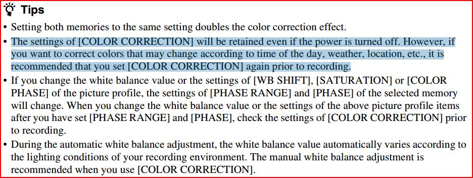 Under varied shooting and lighting conditions as soon as you do another manual white balance those CC settings will not reflect the settings you stored as the 'Phase Range' and 'Phase' of the adjusted CC memories will change. The problem here is many users of this little camera will use 'Auto White Balance.' A few posters on the forum say they run auto white even when shooting concerts etc. As soon as you run auto white balance the CC settings will constantly alter as the camera tries to constantly track white. For those who want to understand the relationship between the white balance and CC interaction the manual gives a pretty accurate description on pages 57 & 58 of the camera's Operating Guide. One extract of which is shown below. Chris Young CYV Productions Sydney |