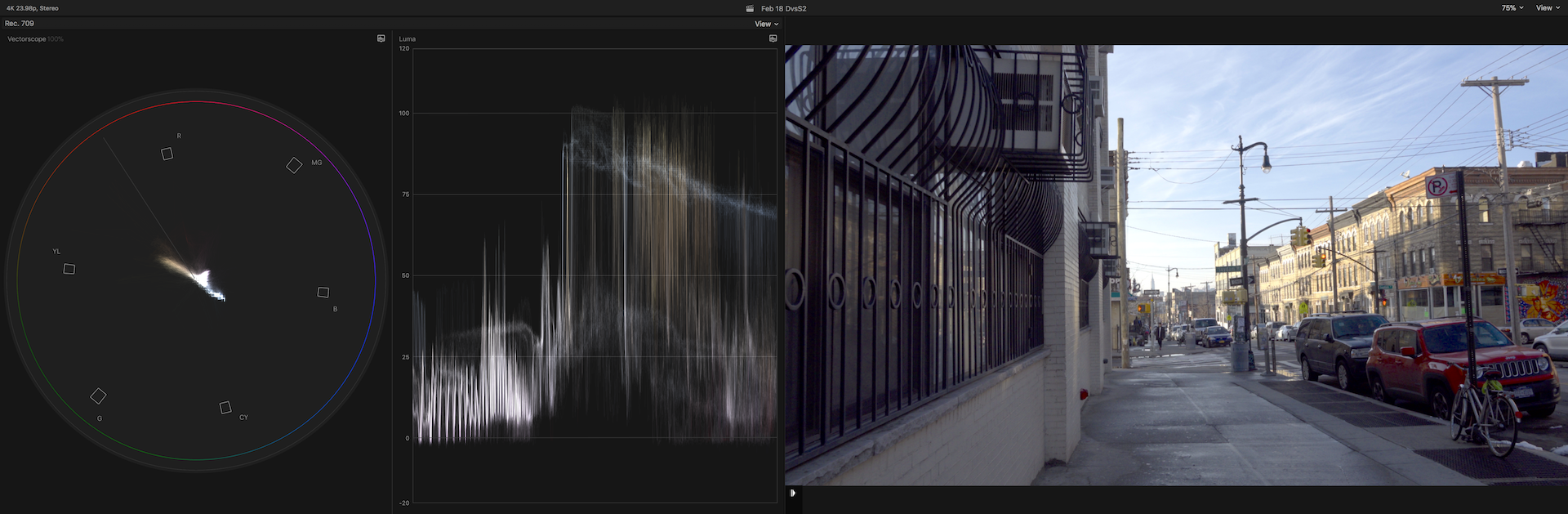 Just the beginning test to see what would work. If it were the red car and the mural of the right, they would be problematic as they may be underexposed and over saturated but that may just be part of incomplete grad. I'd have to see if that can be improved. If genuinely underexposed in an 8 bit 4:2:0 codec shot in S-Log2 it could be irreparable. I shot this because I knew it would present a number of challenges with some potential worse case scenarios. Had the scene involved someone exited the car the exposure would likely had to have been higher.
