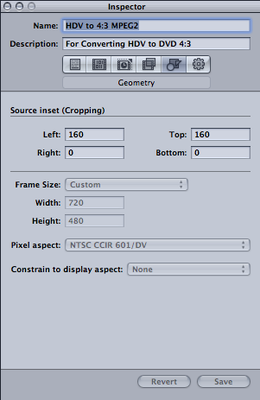 I am trying to downconvert footage shot with the XDCAM at 1080 to work with an existing 4:3 project without getting letterbox. Is there a way to do this in Compressor? I too, would like to crop but don't see how to do this.