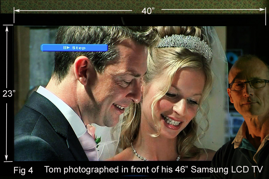 The good bit is the picture quality, and I’ve been photographing my 46” Samsung LCD TV screen in an effort to show you what you can expect. Have a look at the picture and remind yourself that this is an un-retouched shot of me sitting in front of the TV, with the DVD player on pause and the screen filled with last month’s bride and groom singing from the same hymn sheet. All standard definition.