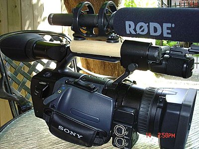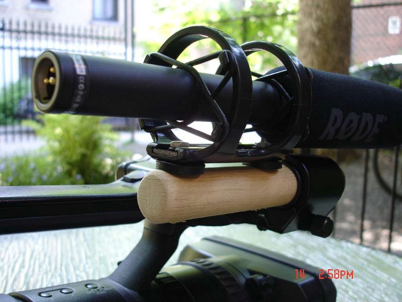 we've been using almost exactly the same solution as you've devised except we've used the complete SM5 unit from Rode, here's a link to it: http://www.rodemic.com/?pagename=Products&product=SM5 Only problem we've found is so far is out of 4 Z1s, two have had the Sony mic holder crack from the load, it's only plastic. So as I mentioned before and sorry I wasn't able to get a photo today, what we've done is to take off the Sony holder and attach the same shock mount as you've screwed to the wood directly into the two threaded holes originally used to hold the Sony original mic holder. To do this you need to enlarge one of the holes in the Rode unit to 3.5 or 4.0mm and drill another hole 28mm from that hole, preferably slightly off centre to compensate for the angle of the LCD screen assembly. This modified Rode shock mount can then be affixed with 2x 10mm long M3 round head screws. I'll try to get a photo asap, it's really obvious once you see what I've done although you do need a drill press and a vice as the Rode mount is hard to hold while you drill the holes. Reason for going to all this bother is the Sony mount seems to allow noise from the zoom, head motors and handling into the mic, there's just not enough mechanical isolation. The Rode mount seems to solve that problem with both 416 and Rode mics. |