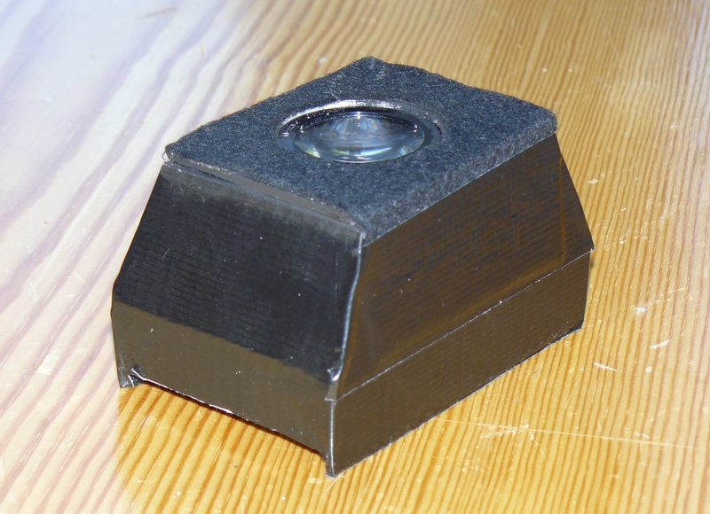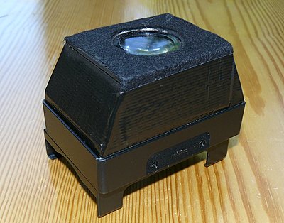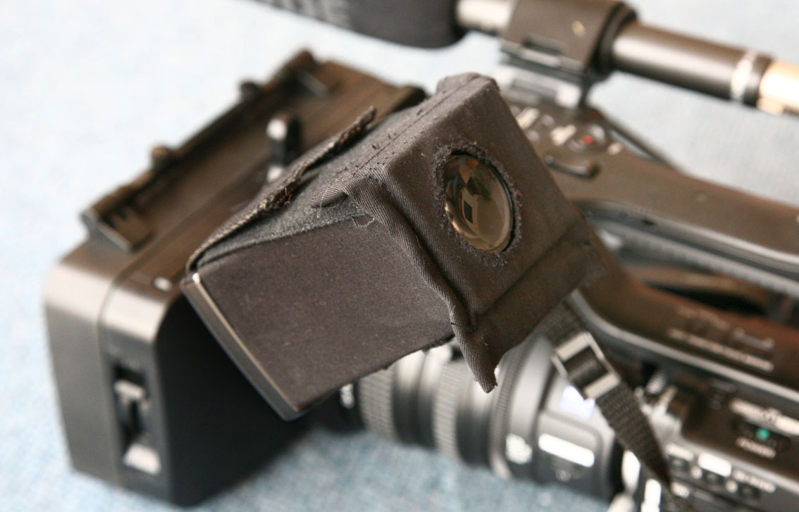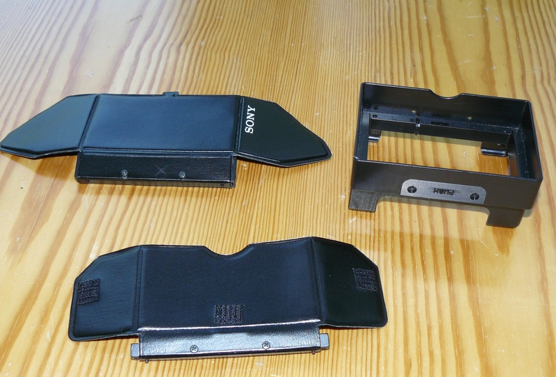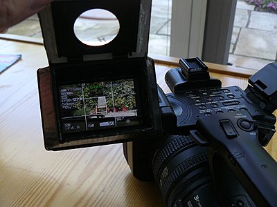 I just made a prototype for the lcd screen of my Z5. I used the originitial Sony lcdhood. You can very easy take away the upper part. The rest is made of 3mm photo carton. The inside is wiith black felt. The lens is from the viewfinder of my old Mamiya 645 photocamera. The result is very good, only left and right 2 or 3 mm is missing.