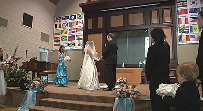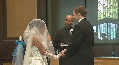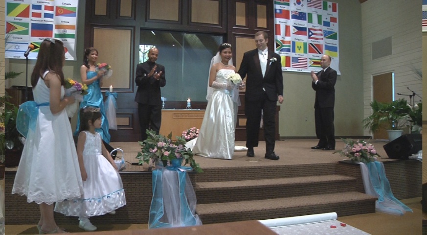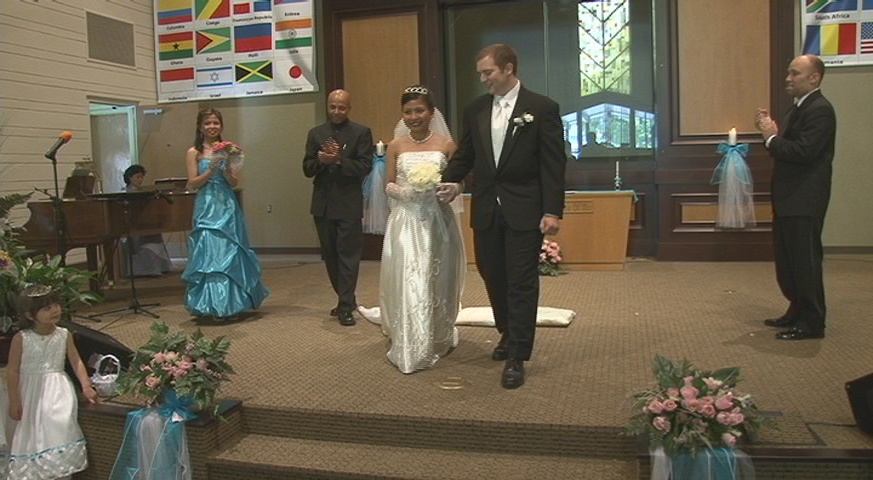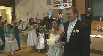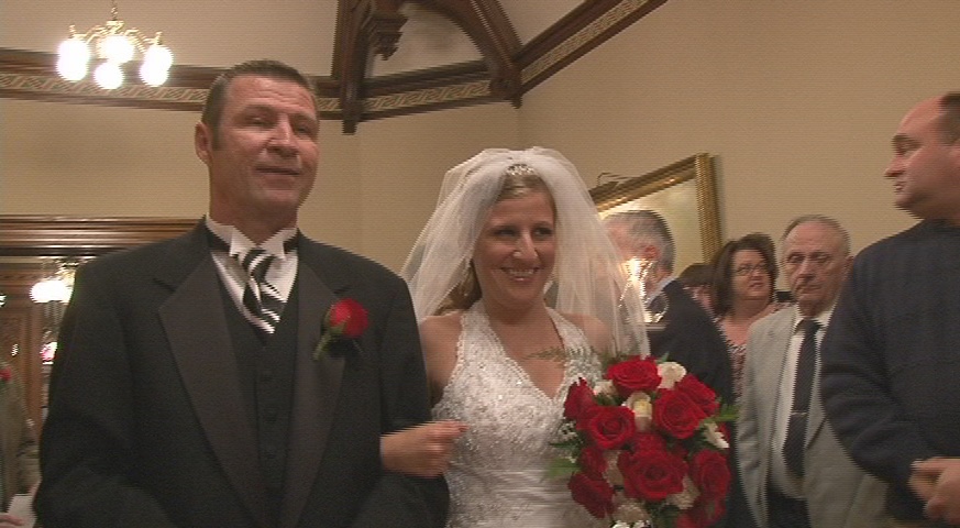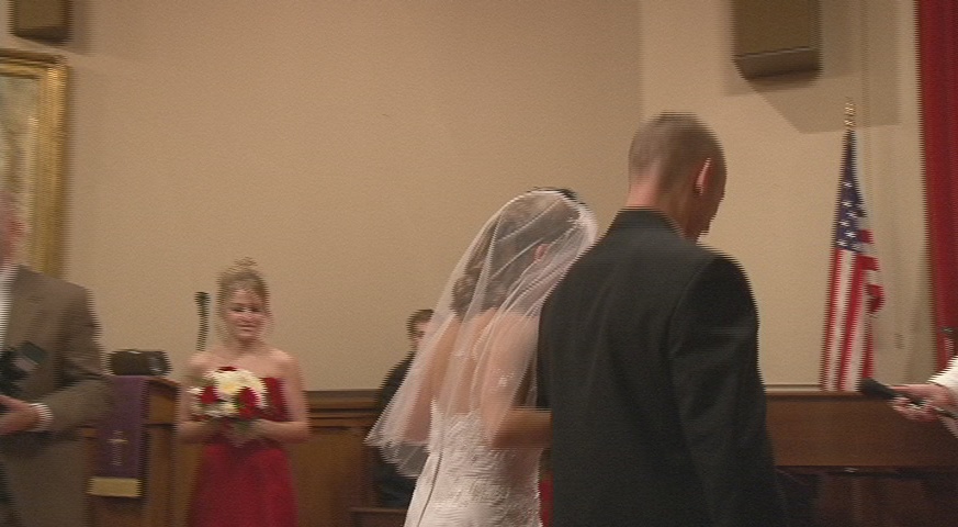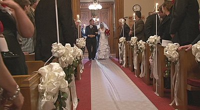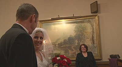 I've shot apporoximately 15 weddings with the 2 FX1000s and as soon as the gain goes up the noise level is noticeable, very noticeable. Since I have spent dozens of hours with the cameras in dark reception halls I submit that I can make this observation safely. I shot my first wedding with the FX1000 next to a VX2100 in a very dark reception and the footage was nearly identical, and the VX2100 was in 16:9 stretch mode, which is not saying much for the FX1000. In my first review of the FX1000 I mentioned it was seemed flat and of low contrast and I still hold to that. Now in perfect light, the Sony is VERY nice. It just doesn't hold up well with increased gain. That is why I'm always running lights whereas with my old Sony's it wasn't as necessary. My primary reason for moving to the FX1000 was for 16:9, not HD. My customers love the widescreen look, as do I. So I've gotten plenty of nice footage from the FX1000, but generally as the bride is coming down the aisle the footage is almost without fail noisy and flat. The images below are typical. |