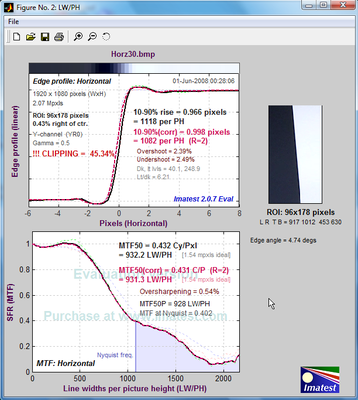 Corrected MTF50 for Red is 1426 LW/PH H, 1448 LW/PH V as measured by Alfonso Parra, again absolute resolution will be somewhat higher than this. PVC have resolution for Red pegged at 1080TVL Then PVC have the EX1 at 1000 TVL. Do we really believe that Red MX only has 80 TVL more resolution than an EX1? PVC also have the F3, AF100 and Canon at half the resolution of the EX1, no-one else has them anywhere near this. If we convert TVL/ph to LW/PH then the EX1 has 2000 LW/PH resolution, from a 1920x1080 camera?????? Hmmm, something not right with these numbers. This is why I like and trust MTF50 tests. They are consistent and repeatable. They also give a measure of how visibly sharp the image will appear as MTF is a contrast measurement and it is the combination of both contrast and resolution that makes images look sharp, not resolution alone.