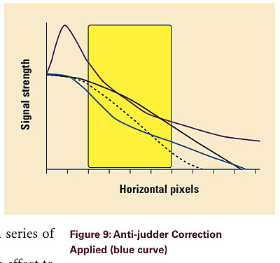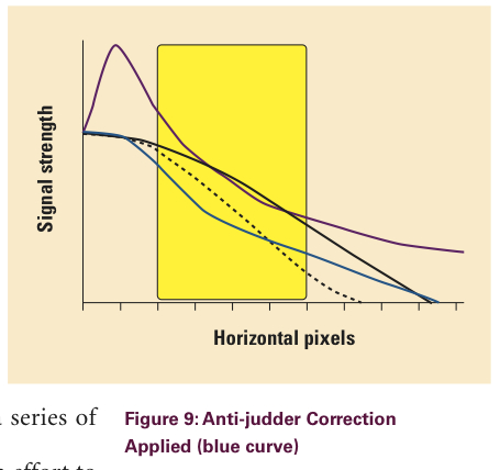 You'll see that with a camera that only has a Sharpness control, you can only hope to reduce the boost without reducing resolution too much. (The dotted line.) Don't fully reduce Sharpness as it cuts resolution too much. (Red line.) The other graph shows the anti-jutter curve available with Cine Alta cameras. It acts to suppress edge sharpness without reducing fine detail.