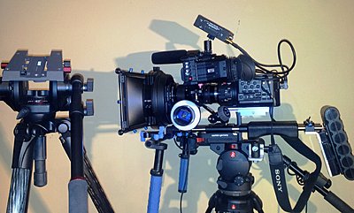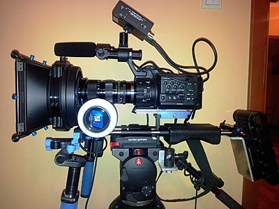 The idea is to get the shoulder pad underneath the camera (in order to balance it better on the shoulder, and make the rig shorter). This was achieved using my old Letus riser v.1 (still must go down some 10-15mm, to get in axis with the mattebox). Speaking of the latter: as can be seen, the RedRock mattebox is way too large (not to mention, heavy) - will probably be getting the Proaim MB-600, or even MB-300, instead. Apart from being smaller/lighter, they can be moved along the rails freely to accommodate the changing length of the lens - while one of the RR MB's shortcomings is it can not go backwards beyond a certain limit, as it would collide with the rails ... As a side note: In the foreground, the surprisingly good Manfrotto 504HD head on the 535 CF legs - very smooth, and lightweight tripod. Ideal for camera-only usage! Its payload though is just 7.5 kg - not enough for the rig depicted...This is comfortably seating on the biggest Manfrotto head, the 526, which is rated at some 15 kg. PS. Looking at my rig, please suggest a better way of attaching the nanoFlash... Mounting it at the hot shoe via a ball joint is only temporary, as it's unnecessarily high this way and spoils the rig's balance !