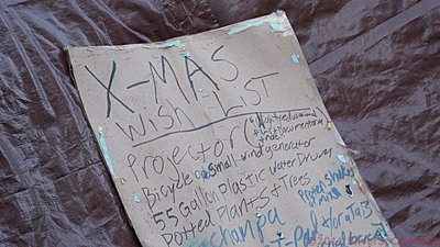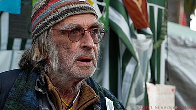 Yesterday I had a chance to use it for a 'real' shoot, part of a documentary I'm doing about artists, one of the artists was interested in going to the "Occupy SF" occupation in San Francisco and interact with the participants. I took and used the FS100 with the Kit lens (18-200). I could have brought some different / faster glass, but sometimes, you just have to bring minimal stuff and hope for the best. Other glass would have slowed me down. I use a self-modified / improved "Steadi Stick" for my hand-held work with my EXs, DSLRs, and now the FS100, instead of a shoulder rig, I find the shoulder rigs (which I have and used to use exclusively for run and gun) start getting pretty huge, pretty obtrusive, and I wanted to retain some of the smallness that is one of the positives of DSLRs in these situations.