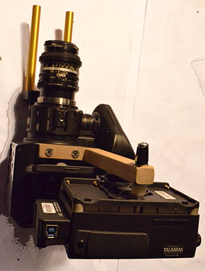 PIX 240 support rigs I built forthe FS100. #1 is a simple wood support. Both it and the mainly metal rig screw into the two 1/4-20 threaded holes on top of the camera. The second is a lightweight metal rig, shown before the main support legs were encased in aluminum tubes. Both rigs put the PIX unit high up, to clear the viewfinder screen. The wood support also moves it to the right side for clearance with less height.