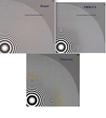 I realise that the XF105 sensor is lower resolution than the F3, but you can clearly see the reduced diagonal resolution of the bayer sensor a trait not matched by either the F3 or MC1P. However the coloured aliases of both the bayer and clearvid sensors are on the same axis and this is because the R and B samples on a clearvid sensor are arranged on the H and V axis the same as bayer, it is the green photo sites that are arranged diagonally which results in the improved diagonal resolution. Most of the zone plates I have seen for the FS100 do exhibit coloured aliasing all be it at a lower level than the F3, but the nulls are in the same places as the F3, thus a similar structure and pixel count may be assumed. Of course, the F3/FS100/FS700 may not be bayer and they may not be clearvid, maybe something else. Interestingly as a side thought, if the FS cameras have a tilted array it may explain the strange flickering overload effect that you can get as pan across strong verticals and horizontals as the number of green pixels sampling V an H increases and decreases on alternate lines.