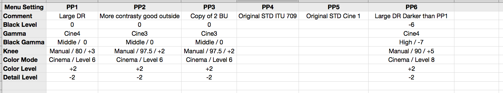 I came up with my PPs the same way I set up every new camera. I spent time playing with it while looking at scopes and eval monitor, under many different lighting (contrast) conditions. I shoot for a decent look out of the camera w/o sacrificing DR. These are the settings I use, PP2 and 3 are my standard goto settings, I have 2 copies so I can tweak one in the field if need be and then quickly go back: