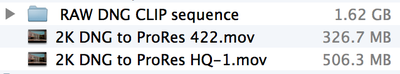 This makes it easy to deal with in FCPX or other Mac Apps. It takes a while but results are good. I will be shooting tests of 2K and HD from the FS700 and O7Q and I will post results here. The monitor and with scopes and focus aids are better than anything on camera I have seen. I am now working out my workflow for using the RAW footage from the FS700. It does take a bit of setting up in the 700 and the O7Q. Dan Keaton and Mitch are working on a settings guide. I have seen the first draft and it is good, it will probably be published tomorrow. Here is the relative size: