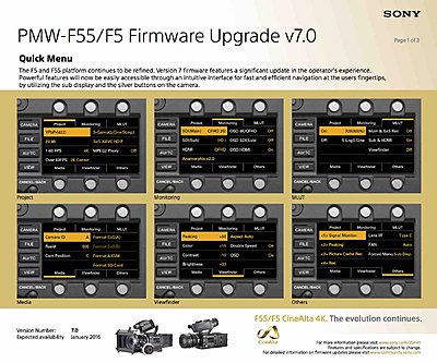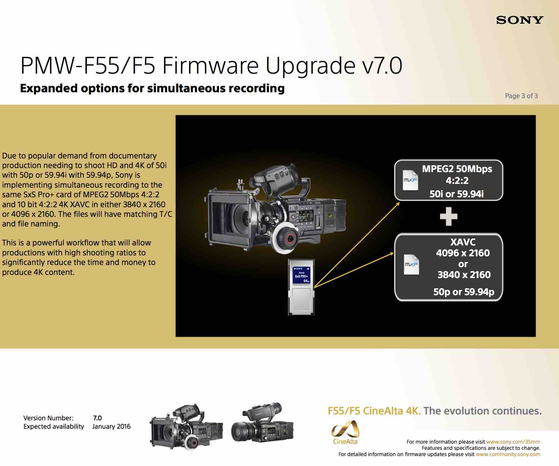 Sony has revealed details of the upcoming firmware version 7 for the F5 and F55 cameras. Its due out in January. Its great how Sony has really stuck to their commitment to continuously updating these cameras. It helps current owners feel like their investment is protected and hopefully it helps prospective owners feel that the these cameras are 'long haul' products, not something to cycled through every 24 months.