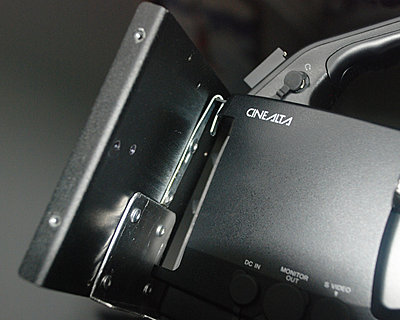 First, I removed the cheek guard that I’d installed upon receipt of the camera. It just seemed, looked, and felt cheap and it wasn’t really doing me any good. I shot a short film with it off and decided not to put it back on. This left two nice threaded holes in the base of the EX3 completely open and unused and since the plastic was about 1/16” thick, I knew it would accommodate that without preventing the shoulder pad from locking shut. All I needed was one more point – near the top of the camera, to mount my adapter plate assembly, so I chose to use the rear strap bracket. This is the little black piece of metal that you can use to run the included Sony shoulder strap through. I can’t imaging ever using that strap, so this bracket became my third mounting point. My goals were: • Use Dionic 90 battery • Mount it at the rear – not the bottom, on a belt, or on the top – for positive weight distribution • Keep cold shoe open and usable for hard drive in the future • Keep all of the rear jacks accessible • Avoid damaging or defacing the camera – must be refersible. First, I tried making a hook for the upper bracket from some aluminum I have. My thought was to “hang” the assembly on that hook and screw it under the shoulder pad. Though I did manage to cut, bend, and file a piece of aluminum to the right size and shape, I could tell that it was no longer very strong. I browsed the hardware aisle at the local hardware store and found a package of heavy duty steel picture hangers. With a little effort, I straightened and bent one of them and then riveted it to the existing Anton-Bauer base plate.