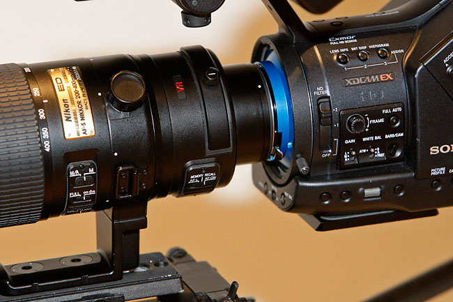 Here are two photos of my new awesome combo –Sony PMW EX3 with the Nikon 200-400 G f4 VR. The blue ring is part of the adaptor.