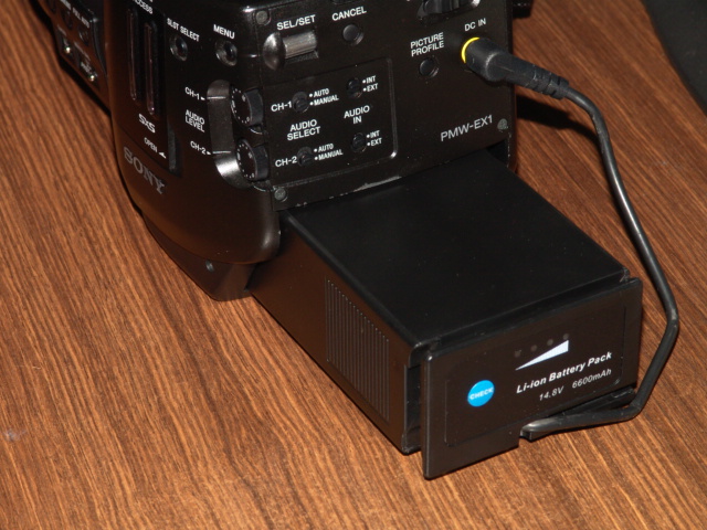 I wanted more power to run an on camera light without having to go to a brick battery and this battery seemed like a bargain. Pros: It comes with a D-Tap lead. A short one terminated in the same plug as used for the EX. Just the D-Tap plug alone down here costs around $35 so it's a worthwhile addition. Assuming the battery lives up to it's claimed capacity it'll run the EX1 and a light for quite a while. Li-Ion batteries have a high internal resistance so the bigger capacity batteries perform better than the smaller ones. It might make hand holding the EX1 easier, see photo! Cons: It's BIG and it's heavier. The weight's barely noticeable but the extra length is very noticeable. The D-Tap connector ends up on the bottom of the battery in the EX1. Not a huge issue however with the plug in it'll be an issue putting the camera down. I think if you were to leave a release plate on the camera then the plug would clear. Like all 3rd party batteries the camera only provides voltage indication so it's a bit harder to know how much juice you have left. After taking the photo I realised the lead can be dressed a bit better by laying it into the groove in the battery, ends up much neater than in the photo. Overall I'm quite happy with this battery. The only other way to get this capacity is quite expensive and between it, the battery that came with the camera and a BP-U60 I can shoot all day off batteries. |