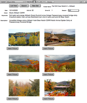 I don't keep the BPAV files. I use XDcam Transfer to make .movs. And I archive those on at least 2 HD's in the field on long shoots, or in the studio at the end of the day. I also make BluRay or DVD's of all the clips. The discs are stored in different buildings and the BluRays/DVD's in a very safe place. Now I only use Macs in my suites, most of my projects are edited by me. I do give producers who request BPAV's the folders but this is rare for me. I also shoot a lot with the 5DmkII and 7D as well as using a NanoFlash often on the XDcams. So it only makes sense to treat every clip the same. You cant use clip browser to look at 5DmkII clips. I use FCP for organizing and viewing the clips. I also have a separate Database program I wrote that keeps track of all my clips including thumbnails, it is keyword searchable and shows what BluRay and discs and folder the clips are in. I can locate and load clips onto my RAID L5's in the edit suites this way very quickly. I don't use FCP for editing much, too slow, we use M100, no rendering, incredible fast NLE. All the clips that have been picked in FCP get transcoded into ProRes422 and dropped into M100. I find this system very fast and efficient. If I have to transfer footage to a TV station or a producer on a piece about one of our clients. I usually just transcode to the format they need usually H.264. And send a HD or DVD. We do this often for our clients. We do a lot of tourism related shooting here in NH. We even do a fair amount of FTP uploads for news features. Everyone is very happy with this system. Below is a screen shot of the DB. Once again I am not preaching everyone adopt this system. This is just my way of dealing with NO-tape footage. We still use a bit of tape as well. This is way faster. And any tape that gets digitized now gets entered into this archive system for easy retrieval and multi location backup.
