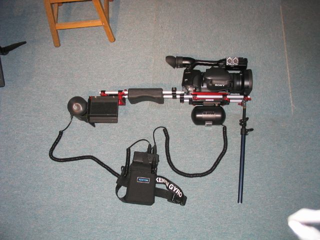 Sorry to hear you have back pain not a fun thing to have to deal with when shooting. I did have the Zacuto 'Newsman Baseplate system for my EX1 a few years ago. I did not have the handles so my system would not have worked for you. Attached is a picture of this rig. I had a DVtec waist holder and spring arm to support the end of the camera. It was a heavy rig with two KS-8 gyros. I now use Olof's setup but have not purchased the shoulder support yet. I still use the spring arm at times. You might want to look into that on DVtec sight. |