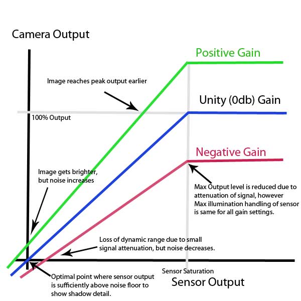 You muddling signal output levels with the actual dynamic range of the camera. Differing amounts of positive gain will of course vary the output signal level, possibly taking it above or below peak white, but this is an output level change, not a dynamic range change. ATTENUATING the input however will mean that some small signals will be lost and this results in a change in dynamic range. Quote: