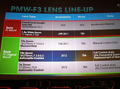 Good to hear the lenses aren't as roundly bad as the few others out there have reported. One wouldn't expect them to feel as lovely as a Zeiss prime given the price point. But sounds like it is reasonably decent and the lack markings on the rings can easily be fixed with white tape and a Sharpie. At first I thought the $1000 price tag for the software upgrade was impossible given how Sony has treated "high-end" feature upgrades on their ENG and pro cameras in the past couple of decades but I actually think I can see their business model on this given that they get their pound of flesh out of the recorders they will sell as a result which will be north of $10,000 from what I can gather. They will also be able to sell a fair amount of high margin memory cards to which there will be no easy workaround, at least in the near term. I made up my mind a few weeks ago to just hang tight until the smoke clears which may not be till the middle of 2011, just to see what the entrants will be as there may be significant downward pressure on pricing once Red gets out of the gate and people really get a tangible sense of the cost/benefit ratio between all the new cameras as they start to get used in a production environment. |