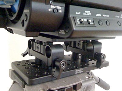 This guy's been building motion control rigs for years, and recently started making a line of camera accessories. His F3 baseplate assembly is incredibly well-made, adjustable and rock-solid. And, it can be completely disassembled in a few minutes, using an allen wrench. It has screw holes that match the F3's front and off-center rear holes, as well as a removable locating pin. Once the camera is attached, it won't budge. I've had mine for a month now, and I like it a lot. Here are some pix--top plate is removed in one, so you can see the assembly, and how it goes together. The bottom cheese plate on mine is mounted forward, to balance the rig I'm using. But it can be moved anywhere, because there are lots of holes. |