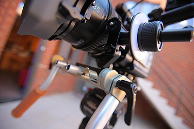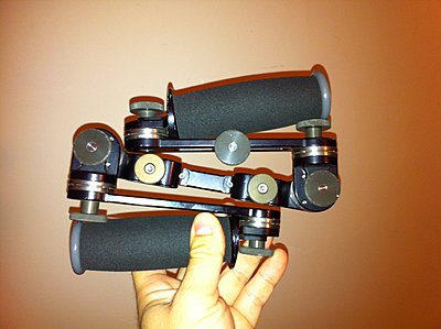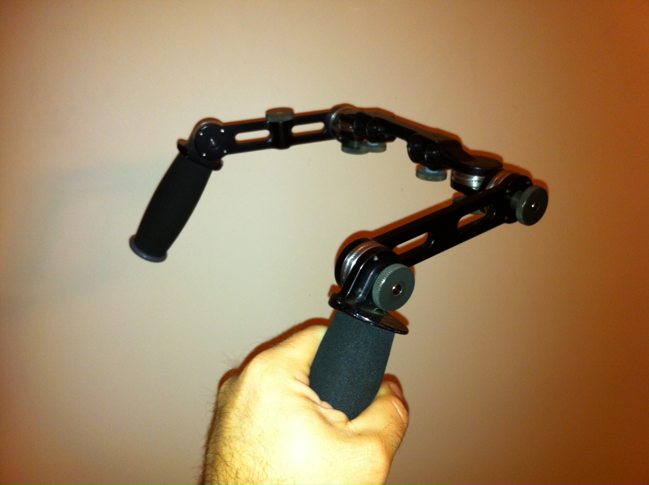 I can see some redeeming qualities in all 3 of the handgrip mechanisms. I would be hard pressed to make an immediate choice until I weighed through the different kinds of shooting I would be doing over the course of the year. Some of the qualities that stand out for me are... On Nate's, the ability to extend the grips out forward and the ratchet mechanisms are good for quick and decisive placement, although the others appear relatively good in this regard. On Alister's, the ability to move the handle mechanism from side to side, particularly to the left so your arms are more in line with the shooter. Also, if you were to have a zoom lens on your rig with motors (you might go there in a year or so), you could have a zoom rocker easily fitted on Alister's & Thierry's handles but really one could make it work on Nate's. Where there is a will there is a way. On Thierry's, the arms are by far the most ergonomically placed. Don't believe me. Thrust your your arms with your hands slightly curled but in a relaxed position. See how your hands are canted? The only problem with Theirry's is length and I have this problem with mine, the Zacuto Z-grips (which I wouldn't recommends in light of these ones). WIth longer ones, you are at an advantage when the rig is on your shoulder but when you go to put it down between takes, unless you have a box or a table to put it on with the end hanging over the end, you have the rig resting on the handles and the heel of the rig. The torque on certain parts of the rig is going to make you wince. Shoulder pads. It is hard to see what some of you have going on. I have the Zacuto pad with the Z-riser. It's passable but absurdly expensive for what it is. I still laugh 2 years later when I look at the Zacuto shoulder pad knowing what I paid for it. I picked up a GENUS shoulder pad on seeing Andy Shipsides demo it with an AF-100 rig but didn't know the pad would come without the rails attachment piece. The Genus shoulder pad is simple but amazing. I am sure Alister will attest to it. Not sure though if the Genus rig has the ability to get the pad under the camera, if need be. |