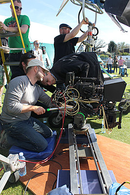 We shot using 2 sets of band new Zeiss Ultra's, mainly at 32mm and 50mm (very nice) as well as some older and very heavy Arri 100mm macro primes. Our only small issue was that the follow focus motors were shifting the camera very slightly due to flex in the tripod base plate on the F3. You probably wouldn't notice this at most normal focal lengths in 2D but in 3D small shifts are very obvious. So a stiffener plate for the base will be needed to prevent this (as well as general flex) or a pair of 15mm rails mounted to the top holes on the F3 body. We were recording to a Nano3D (2 x Nano Flashes) as well as to a Mac workstation recording ProRes in the video village. The video village allowed for instant playback on 50" 3D monitors in a blacked out tent for review and tech assessment by the lead stereographer. It was an outdoor shoot in great weather. As well as the F3's there was a second rig with a pair of Phanton HD Gold 35mm high speed cameras shooting 3D at 1000fps. So even thought the sun was shining brightly, many shots were done with 2 or 3 18kw lamps!! The end of day was spent shooting some blue screen effects shots that will be matted in to the finished commercial. I'm under NDA so can't talk about the subject just yet, or post any pictures, but once the ad is released (2 weeks time!!) I'll be able to post some grabs and photos.