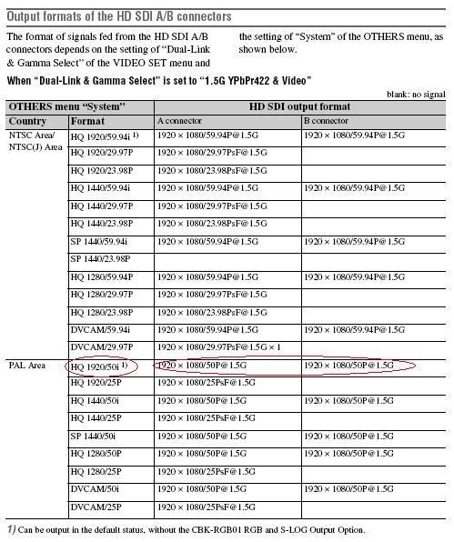 This indicates that when using 1.5g dual link @ 50p a valid 50i (or 60i for NTSC) signal will be present at each of the A and B ports (though with an inverse field/line relationship so they sum back into a full progressive frame when both links are recombined). If you are in RGB mode on the F3 the 1.5g dual link will not produce a usable signal from only one port (believe me, I've tried and hoped it would) but if you are in 4:2:2 video mode it will work. You can check out the entire paragraph where this comes from here - Serial digital interface - Wikipedia, the free encyclopedia ----------- In the case of 1080p60, 59.94, or 50 Hz video over a dual link; each link contains a valid 1080i signal at the same field rate. The first link contains the 1st, 3rd, and 5th lines of odd fields and the 2nd, 4th, 6th, etc. lines of even fields, and the second link contains the even lines on the odd fields, and the odd lines on the even fields. When the two links are combined, the result is a progressive-scan picture at the higher frame rate.