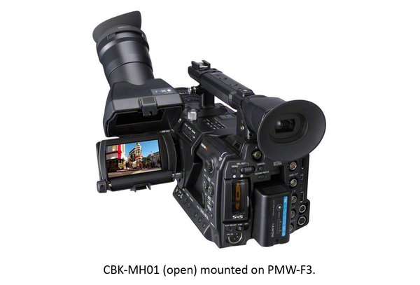 The CBK-MH01 LCD Monitor VF Hood is designed to be attached to the LCD monitor of the PMW-F3K/F3L Solid-State Memory Camcorder to enable viewing the screen of the LCD monitor through the magnifying lens and eyecup of the CBK-MH01. The CBK-MH01 allows you to adjust the angle of the LCD monitor within 75 degrees or to view the LCD monitor screen directly by flipping up the eyepiece.
