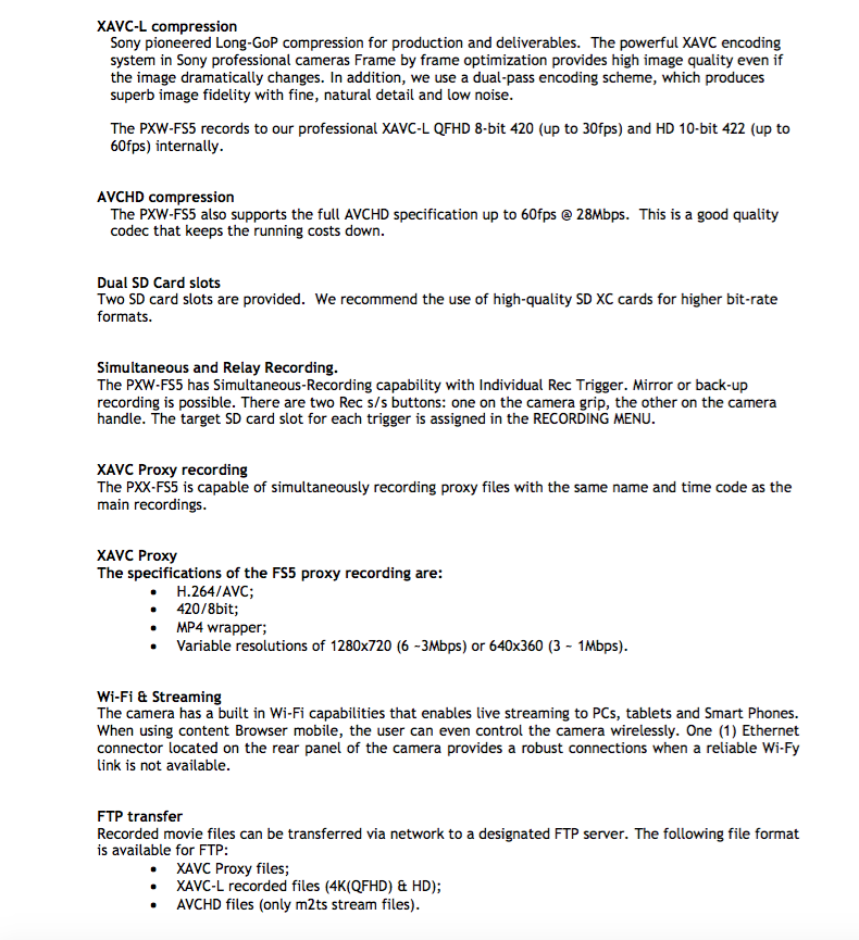 Today Sony has announced a new camera under the FS7 in their CineAlta line, the FS5. The FS5 has many of the same features that the FS7 has. Some of the biggest differences include the FS5 having an FS700-like slow-motion capability, it can record up to 240fps in camera at full HD but only for a 7 second buffer window. The FS5 records 4K in 4:2:0 8-bit Long-GOP at 100mbps. It records HD in 4:2:2 10-bit Long-GOP at 50mbps. Because it is using more compression it can record this video to SD cards. It also lacks a RAW output option, though a paid RAW upgrade is said to be coming in the future. The camera is smaller and lighter then the FS7. Sony is actively promoting its use on drones and gimbal systems.