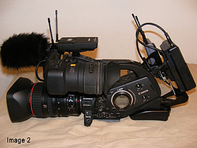 I need to mount two wireless receivers on my Canon XL-H1a. Most of the time I have one on the included bracket that goes on the back of the camera and one on the hot shoe. However, there are times when I need the hot shoe for lighting, so I always end up having a receiver dangling or taped to the mic or something, not exactly a good thing. (Image 1 shows how I mounted receivers in the past.) I've recently added a Firestore FS-C to my kit and things got a bit more cramped. (Image 2 shows the old way I mounted receivers 2 receivers and the FS-C) What put me over the edge was ordering a whole new set of mics, two sets actually. Since adding the FS-C I've had the one receiver that is mounted in the back attached with Velcro on the back side of the back bracket close to the battery. (Image 3 shows also shows the old way I mounted 2 receivers and the FS-C) My new receivers have the battery compartment in a place where I would have to totally remove the unit to replace batteries and the on/off switch was in a real bad spot. So I made a bracket to fix my problem. I hope someone else can use this to solve the same problem I had. Here's how I did it. I went to my local Ace Hardware and purchased a piece of aluminum plate, it measured 4" x 10" x .032 thickness. I then cut about an inch off the length and bent the metal so that I had a U shaped bracket with 2" ears on each side. I drilled a hole in the middle of it that lined up with where the hole in the Canon bracket is, which is also where the mounting stud/screw goes through to secure my FS-C cradle. I rounded the corners off with a Dremel tool to prevent sharp edges from cutting things and painted it with some flat black spray paint. (Image 4 shows the bracket) I have Velcro attached to the Canon bracket so I added some to the back of the new bracket which will allow it to stay attached should I remove the FS-C and it also helps keep the bracket secure. I added some Velcro to the outside of the ears and also to the new Sony receivers. They are very secure and the battery compartments and on/off switches are easy to get to. (Images 5, 6 and 7 show how it all went together) The nice thing about this bracket is everything still fits in my Kata bag without having to remove it. All I have to do is unplug the firewire from the recorder and bend the receiver antennas forward a bit. It also adds a little weight to the back of the camera which really helps balance the front heavy XL. Total cost was less than $15 and this setup is working like a charm.