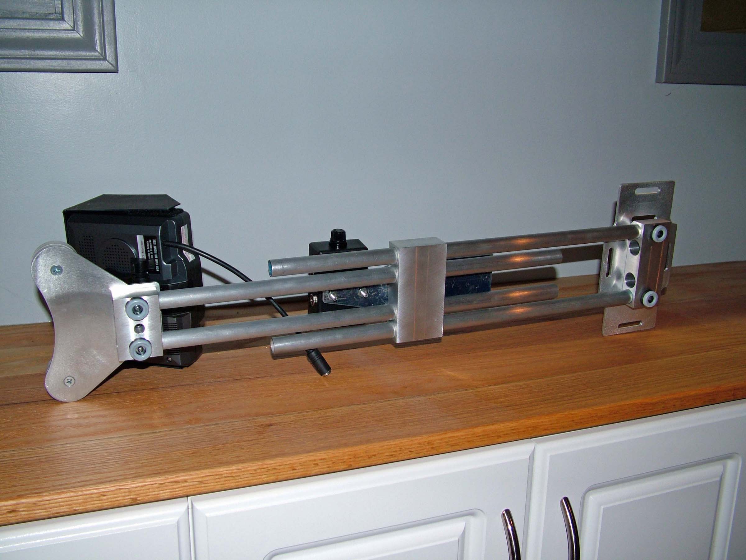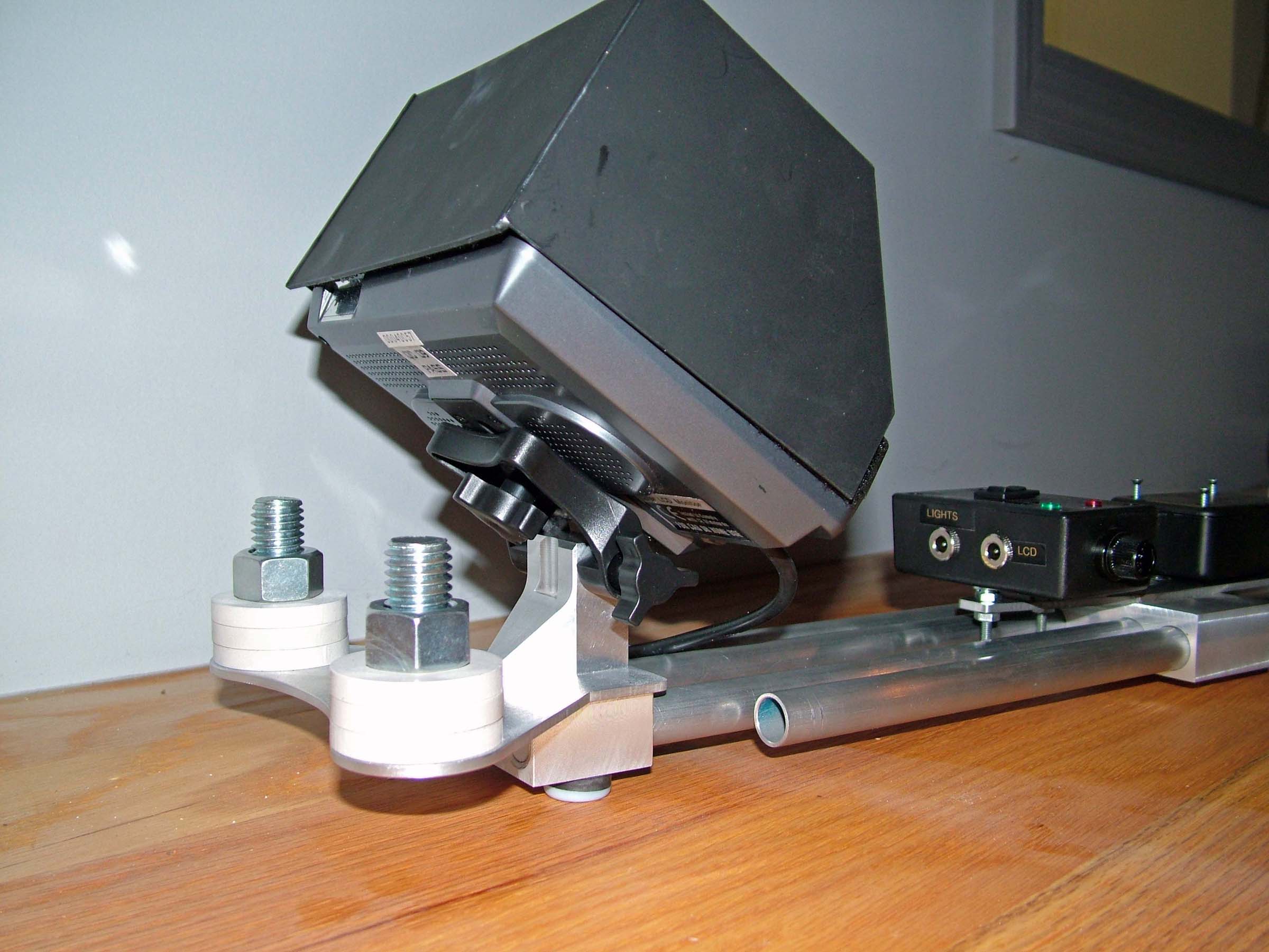 This is my prototype lower stage. The finished product will be 6061 aluminum that will be anodized black. Since the LCD is so light, I had to add counterweights to help with the dynamic balance of the sled. I know that I'll have to be very careful to make sure both posts receive the same amount of weight so I'm not unbalancing the sled. Last night I ran my LCD and LED lights for over 2 hours straight before the battery dropped so low that the LCD started to fade out. I could have ran the LED lights for another hour after that without the LCD :) Any feedback would be appreciated! Thanks. |