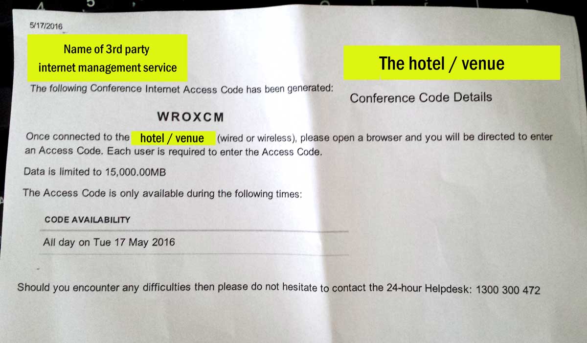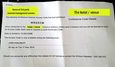 They literally don't have enough internal networking ports to service all their function rooms etc at the same time. And this is a big major hotel that is part of a larger chain. One of the bigger issues that will be systemic wherever we go is ... internet isn't any particular persons responsibility. The event coordinator for the hotel? Not their area of expertise and understandably so as it is a technical thing. The AV guy/ audio contractor? He gets bundled with it as it is a technical thing, but he has no control over the networking setup at the hotel ... which is another area altogether. The internet access etc is managed by a third party who have their offices ... in New Zealand. NZ? No, I don't know why either. They administer the IT side of things remotely. And to top it off, their whole provisioning model revolves around download access to guests who must authenticate with a web browser before you can get anywhere. Let's just say that my hardware streaming video encoder does not have a web browser to jump through their security hoops with. This is the piece of paper generated by the hotel for the test today. We had an access code but no wired connection. I'm now going to write a big email stating our requirements that their NZ contractor will get to see. Could be worse ... I could have turned up on Saturday without having done a pre-test during the week. Andrew |