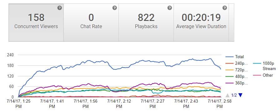 Assuming 3 hours of live streaming, that'd be somewhere around 5Gb upload in total? Also, in terms of viewership on mobile phones, do you think your audience is opting for the 1080 or throttling back to a more conservative 480 (or 360/ 720 etc) live stream to save data? |